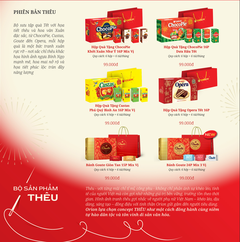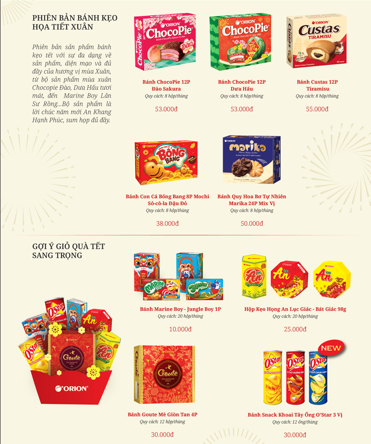 Bên cạnh các hộp quà, Orion cũng làm mới diện mạo cho các sản phẩm bán lẻ với chủ đề “VỊ XUÂN ĐONG ĐẦY”. Những sản phẩm quen thuộc khoác lên mình họa tiết Tết đặc sắc, là lời chúc năm mới sum họp đủ đầy, bao gồm: