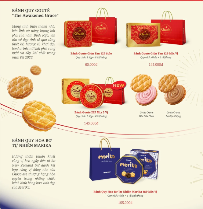 - Bánh Quy Gouté: Mang tinh thần “The Awakened Grace”, Goute lan tỏa vẻ đẹp tinh tế, khơi dậy hành trình mới bứt phá cho năm Bính Ngọ. Các sản phẩm có giá 60.000 VNĐ và 145.000 VNĐ.