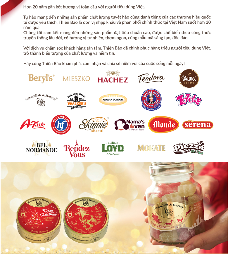 Hơn 20 năm qua, Công ty Bánh kẹo Thiên Bảo (TBCC) đã tự hào là cầu nối mang “Hương vị của Thế giới” (Flavour of the World) đến với người tiêu dùng Việt. Với cam kết mang đến những sản phẩm chất lượng tuyệt hảo từ các thương hiệu quốc tế được yêu thích, Thiên Bảo chính là bảo chứng cho những giỏ quà Tết đẳng cấp và ý nghĩa nhất.