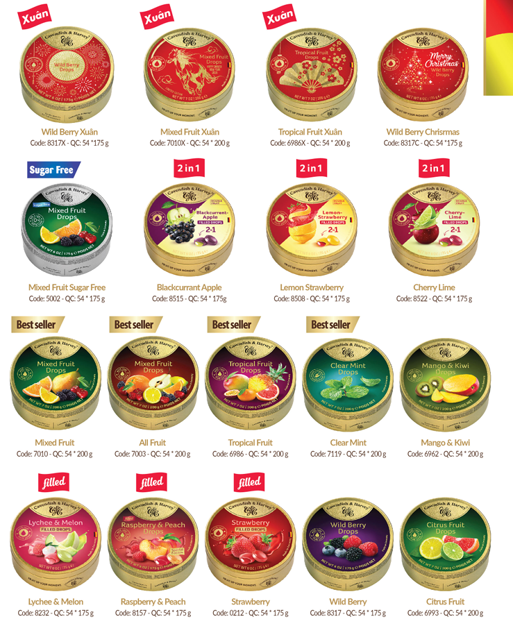 - Kẹo trái cây & Toffee: Đắm chìm trong hương vị trái cây tự nhiên của kẹo Cavendish & Harvey (Đức) hay vị bơ sữa ngọt ngào từ kẹo Anh quốc Walker’s Nonsuch.