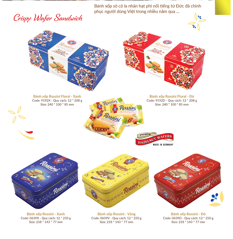 - Bánh quy nhập khẩu: Khay bánh Tết của bạn sẽ thêm phần phong phú với bánh xốp Rossini (Đức) hay các dòng bánh quy A-Taste thơm giòn.