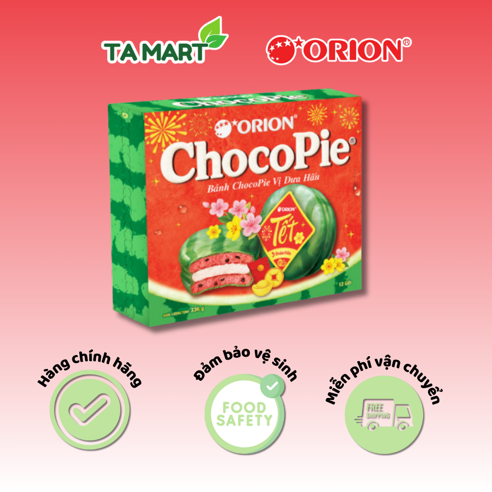 Bánh ChocoPie Orion vị dưa hấu hộp 336g (12 cái) là sản phẩm mới với vị dưa hấu mát lạnh cùng socola thơm ngọt đầy lôi cuốn. Bánh chocopie Orion là thương hiệu bánh nổi tiếng tại Hàn Quốc với rất nhiều loại bánh chocopie thơm ngon từ socola với nhân marshmallow dẻo ngọt.