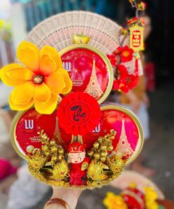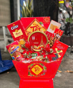- Tạo Hình Đẹp Mắt: Hộp bánh LU thường có thiết kế tròn, với tông màu đỏ nổi bật và hoạ tiết tinh tế, rất dễ dàng để sắp xếp, xếp chồng lên nhau, tạo nên sự cân đối và hoành tráng cho Tháp Bánh Kẹo trưng bày Tết.